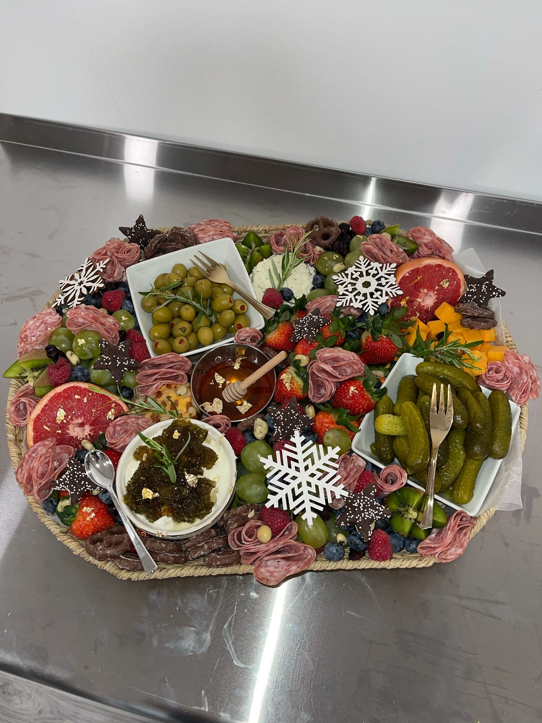 An elevated, party-ready charcuterie tray designed to impress. This generously sized tray features artisan cheeses, cured meats styled into roses, fresh seasonal fruit, olives, pickled vegetables, spreads, chocolates, crackers, and festive holiday accents. Finished with thoughtful details and elegant presentation, it’s perfect for hosting, gifting, or serving as the centerpiece of your holiday gathering.